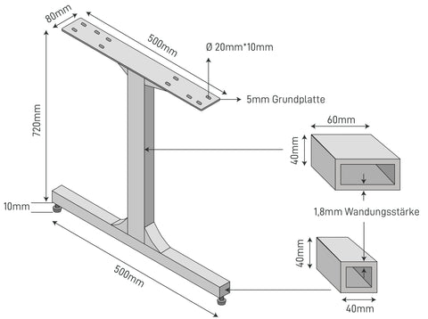 Het lineaire tafelframe met sleufgaten (20x10mm) maakt individuele, snelle montage mogelijk.Dankzij dein hoogte verstelbare poten dehoogte individueel De hoogte kan individueel worden aangepast aan de vereisten. De skids biedenzelfs op oneffen ondergronden flexibele ondergrond, zelfs op oneffen terrein.